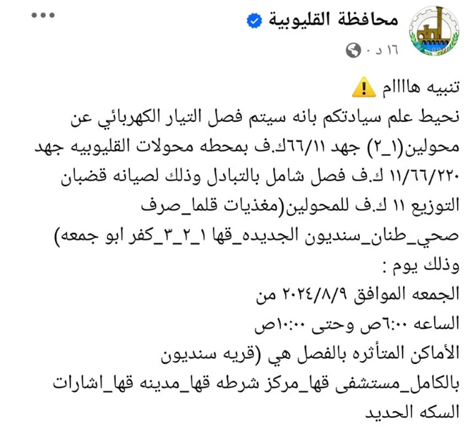 وذلك لصيانة قضبان التوزيع 11 ك.ف للمحولين (مغذيات قلما - صرف صحي - طنان - سنديون الجديدة - قها 1_2_3_كفر أبو جمعة، وذلك يوم الجمعه الموافق 2024/8/9 من الساعة 6:00 ص وحتى 10:00 ص.