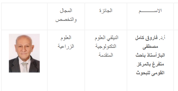 وكان من بين الفائزين من أساتذة المركز لجائزة النيل في العلوم الزراعية الأستاذ الدكتور فاروق كامل مصطفى الباز، أستاذ باحث متفرع بالمركز، فيما فاز بجائزة الدولة التقديرية في العلوم الزراعية الأستاذ الدكتورمحفوظ محمد مصطفى عبد الجواد، أستاذ باحث.