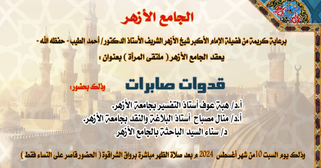 يعقد الجامع الأزهر الشريف السبت المقبل، الحلقة الثالثة من الموسم السادس عشر من برامجه الموجهة للمرأة والذي يأتي تحت عنوان "قدوات عابدات"، وذلك برعاية الإمام الأكبر الدكتور أحمد الطيب، شيخ الأزهر الشريف، وبتوجيهات الدكتور محمد الضويني وكيل الأزهر، وبإشراف الدكتور عبد المنعم فؤاد، المشرف العام على الأنشطة العلمية للرواق الأزهري، والدكتور هاني عودة، مدير عام الجامع الأزهر.