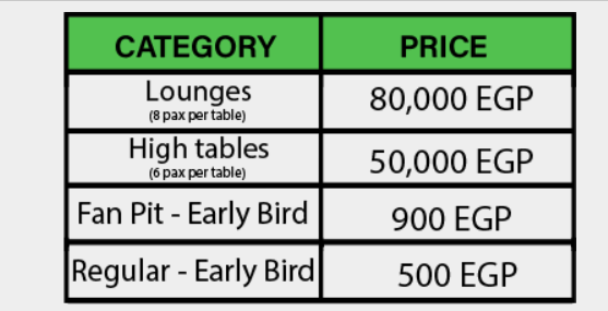 قسمت أسعار التذاكر إلى 4 فئات: الأولى 500 جنيه، الثانية 900 جنيه، الثالثة 50 ألف جنيه لـ6 أفراد، والأخيرة 80 ألف جنيه لـ8 أفراد.