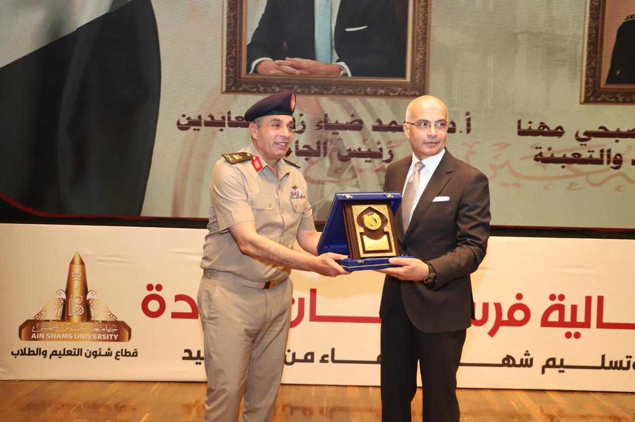 وتقدم رئيس جامعة عين شمس بخالص الشكر والتقدير للواء محمد صبحي مهنا - مدير إدارة التجنيد والتعبئة بالقوات المسلحة على ما بذله من جهد لنقف اليوم بين أبناءنا من ذوي الهمم لنضع سطرًا جديدًا من سطور المستقبل لتحقيق رؤية جامعة عين شمس الجديدة