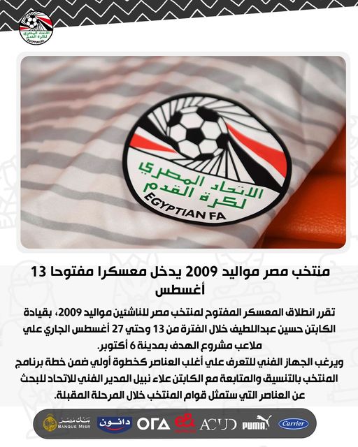 تقرر انطلاق المعسكر المفتوح لمنتخب مصر للناشئين مواليد 2009، بقيادة الكابتن حسين عبداللطيف خلال الفترة من 13 وحتى 27 أغسطس الجاري علي ملاعب مشروع الهدف بمدينة 6 أكتوبر.