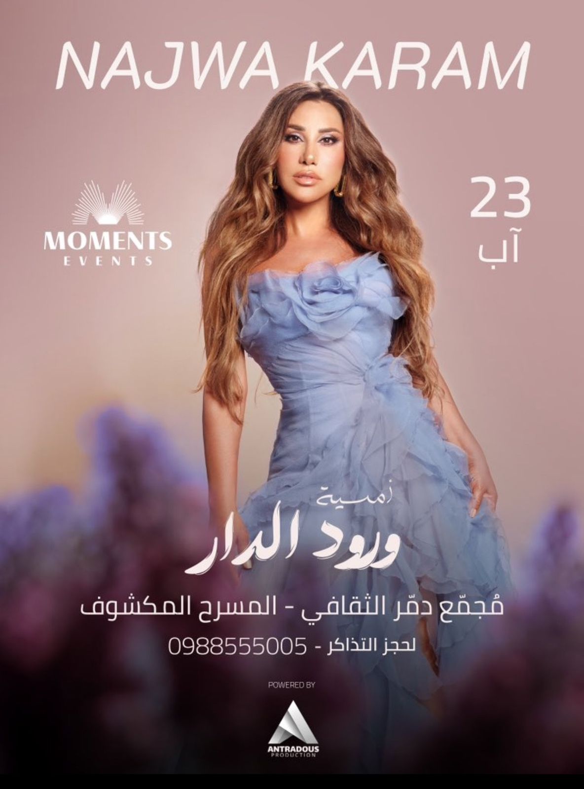 يقام الحفل 23 أغسطس بعنوان “ورود الدار” في مجمع دمر الثقافي على المسرح المكشوف، وتم طرح التذاكر عبر الموقع الإلكتروني.