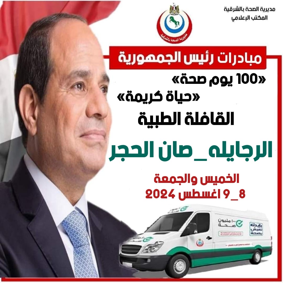 تنطلق غدًا الخميس، قافلة طبية مجانية بقرية الرجايله التابعة لمدينة صان الحجر بمحافظة الشرقية، وذلك ضمن المبادرة الرئاسية «حياة كريمة»و 100 يوم صحة.