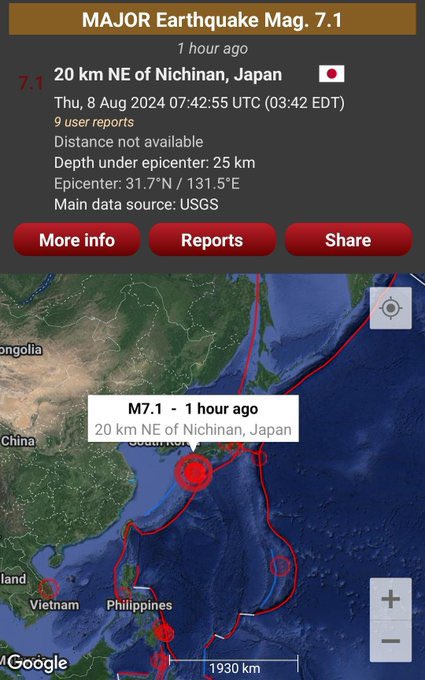 في صباح اليوم الخميس، انتشرت حالة من الرعب والهلع بين سكان العالم إذ ضرب زلزالان اليابان بقوة 6.9 و7.1 درجة على مقياس ريختر، الساحل الجنوبي لليابان والأمر الذي جعل العالم في حالة قلق ومخاوف كبيرة من حدوث تسونامي، خاصة بعد إصدار وكالة الأرصاد الجوية اليابانية بيانًا يحذر من احتمالية حدوثها.