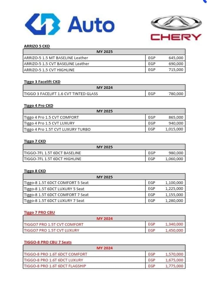 وفقاً للقائمة السعرية الصادرة عن مجموعة جي بي أوتو تقدم سيارات شيري تيجو 7 برو موديل 2024 في السوق المصرية بفئتين من التجهيزات.