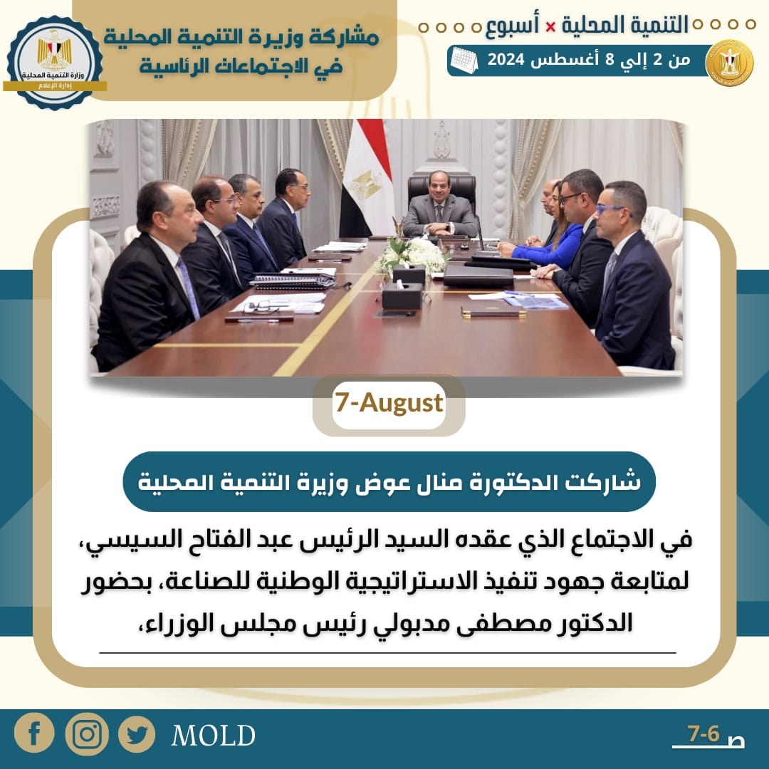 شاركت الدكتورة منال عوض وزيرة التنمية المحلية في الاجتماع الذي عقده السيد الرئيس عبد الفتاح السيسي، لمتابعة جهود تنفيذ الاستراتيجية الوطنية للصناعة، بحضور كل من الدكتور مصطفى مدبولي رئيس مجلس الوزراء، والفريق كامل الوزير نائب رئيس مجلس الوزراء للتنمية الصناعية وزير الصناعة والنقل، والمهندس محمد صلاح الدين وزير الدولة للإنتاج الحربي، والسيد أحمد كجوك وزير المالية، والمهندس شريف الشربيني وزير الإسكان والمرافق والمجتمعات العمرانية، والمهندس محمد شيمي وزير قطاع الأعمال العام، والمهندس حسن الخطيب وزير الاستثمار والتجارة الخارجية.