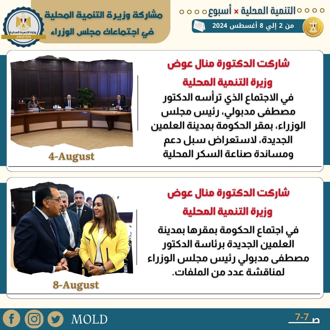 كما شاركت الدكتورة منال عوض وزيرة التنمية المحلية في، اجتماع الحكومة بمقرها في مدينة العلمين الجديدة، برئاسة الدكتور مصطفى مدبولي، رئيس مجلس الوزراء لمناقشة عدد من الملفات.