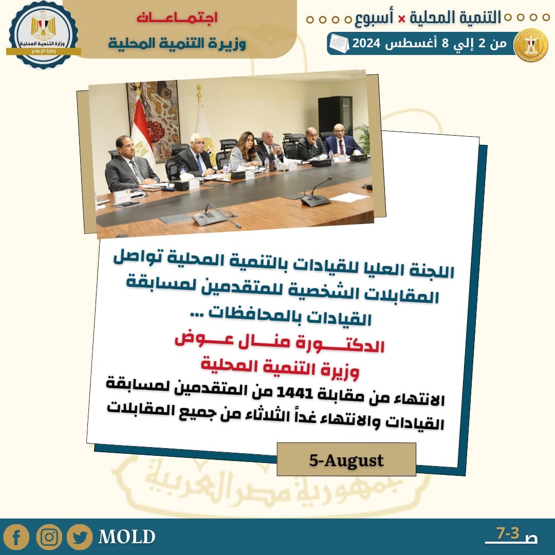 واصلت اللجنة العليا للقيادات بوزارة التنمية المحلية برئاسة الدكتورة منال عوض وزيرة التنمية المحلية عملها لإجراء المقابلات الشخصية للمتقدمين لمسابقة الوزارة رقم (3) لسنة 2023 لشغل 91 وظيفة قيادية بالإدارة المحلية على مستوى جميع المحافظات، موضحًة إنه تم اجراء المقابلات الشخصية لعدد 1441 من المتقدمين لمسابقة القيادات حتي اليوم الاثنين من إجمالي 1541 متقدماً والذين تم فحص ملفاتهم وتنطبق عليهم الشروط، وقدموا المستندات الخاصة بالمسابقة والوظيفة وأجروا الاختبارات والامتحانات بمقر الأكاديمية الوطنية للتدريب وبعض الجهات الأخرى بالدولة.