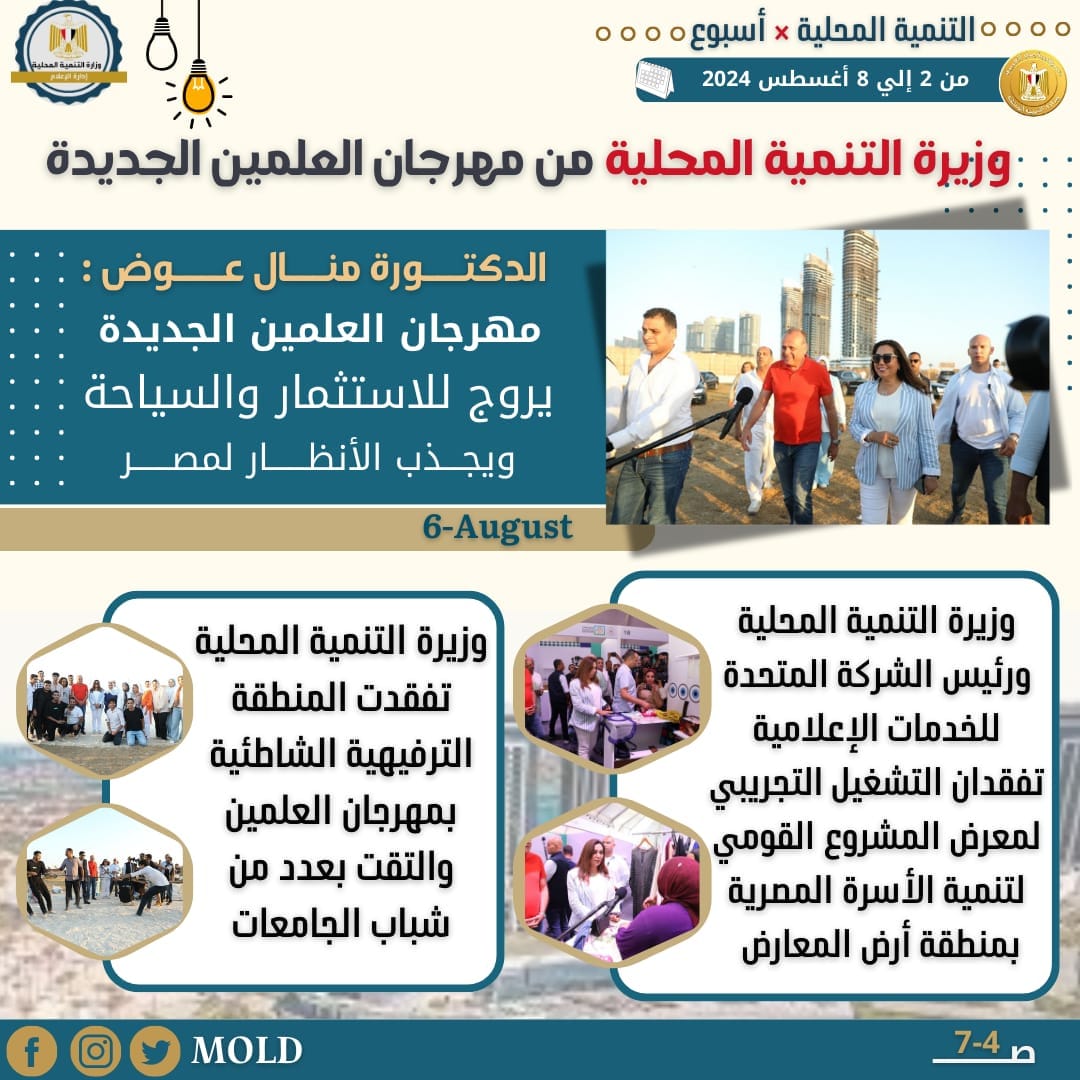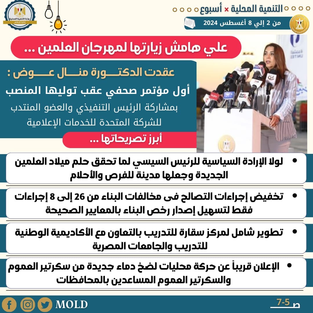 وعقدت الدكتورة منال عوض وزيرة التنمية المحلية، علي هامش زيارتها لمهرجان العلمين مؤتمراً صحفياً هو الأول منذ توليها المنصب الرئيس التنفيذي والعضو المنتدب للشركة المتحدة للخدمات الإعلامية وبحضور مختلف وسائل الإعلام وذلك علي هامش الجولة التفقدية وزيارتها لمهرجان العلمين بالساحل الشمالي لتفقد الأنشطة والفاعليات المقدمة.