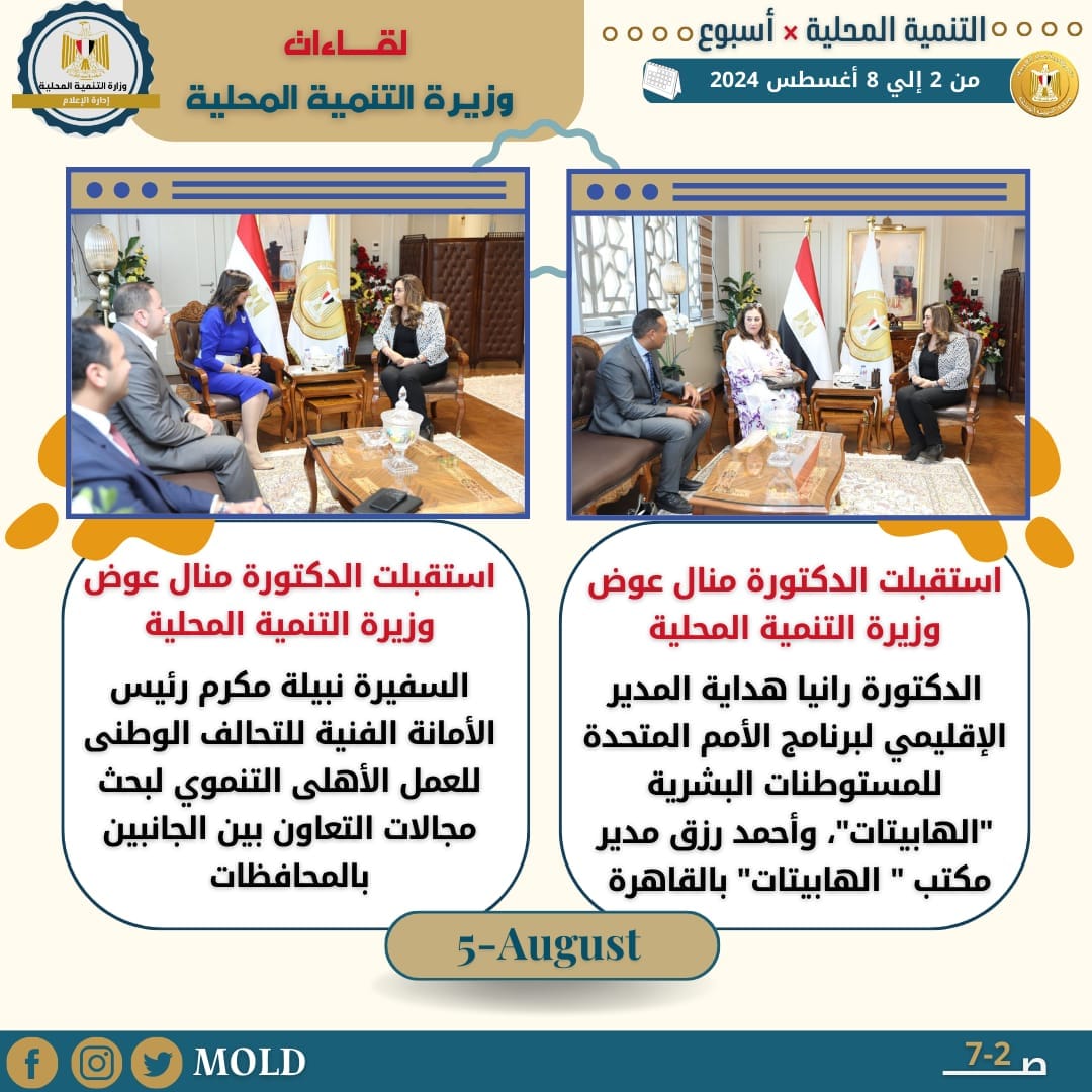 واستقبلت الدكتورة منال عوض وزيرة التنمية المحلية، الدكتورة رانيا هداية المدير الإقليمي لبرنامج الأمم المتحدة للمستوطنات البشرية "الهابيتات"، وأحمد رزق مدير مكتب " الهابيتات" بالقاهرة وذلك بمقر وزارة التنمية المحلية بالعاصمة الإدارية الجديدة، لبحث ملفات التعاون المشترك والتحضيرات الجارية لاستضافة مصر للمنتدى الحضري العالمي.