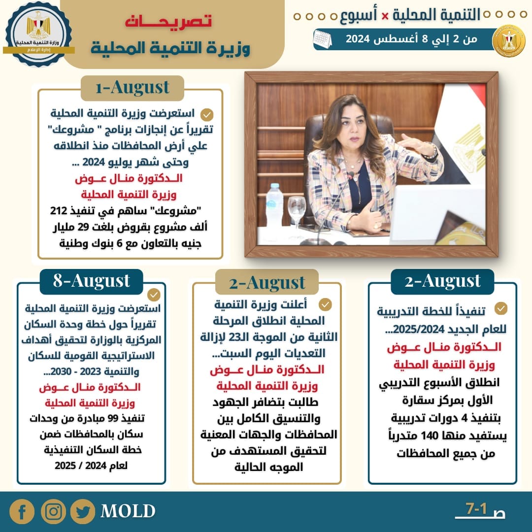 أعلنت الدكتورة منال عوض وزيرة التنمية المحلية، عن انطلاق الخطة التدريبية الجديدة للمحليات للعام المالى 2024-2025، الأحد الموافق 4/8/2024، بمركز التنمية المحلية للتدريب بسقارة ، موضحًة أنه سيتم افتتاح الأسبوع الأول من الخطة الجديدة للعام المالى 2024/ 2025 بتنفيذ 4 دورات تدريبية، ويستفيد من هذه الدورات 140 متدرباً من جميع المحافظات .