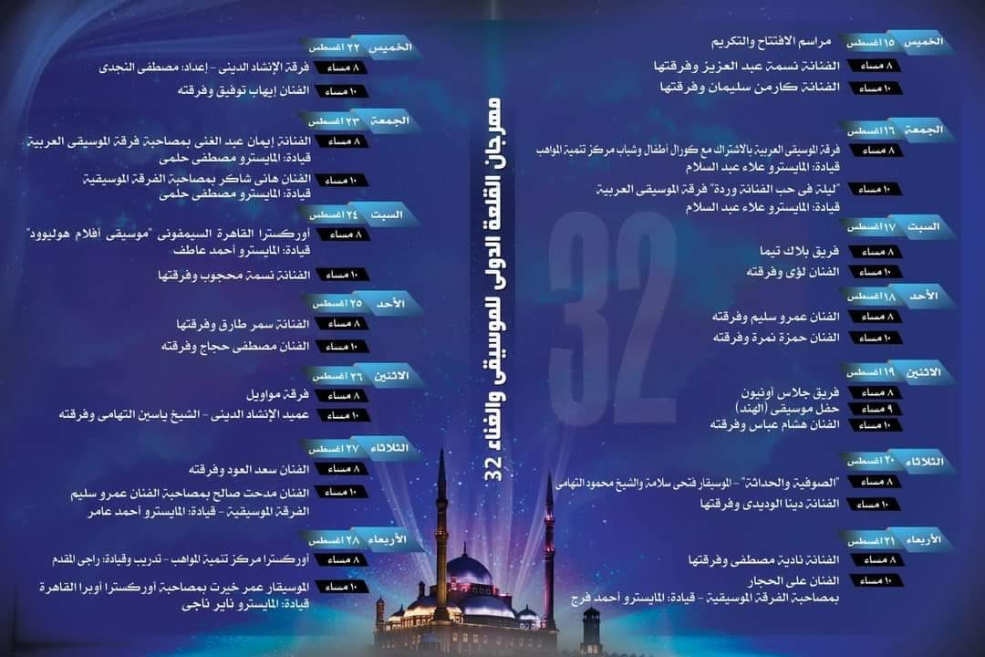 يذكر ان برنامج فعاليات مسرح المحكى بمهرجان قلعة صلاح الدين للموسيقى والغناء فى دورته 32  يشمل عروضا لكل من "الفنانة نسمة عبد العزيز وفرقتها ،الفنانة كارمن سليمان وفرقتها، فرقة الموسيقى العربية بالاشتراك مع مركز تنمية المواهب، ليلة موسيقى عربية (أغاني وردة) قيادة: علاء عبد السلام، فريق بلاك تيما، الفنان لؤي وفرقته ،الفنان عمرو سليم وفرقته ،الفنان حمزة نمره وفرقته ،فريق جلاس أونيون،  الفنان هشام عباس وفرقته ،الصوفية والحداثة - الموسيقار فتحي سلامة والشيخ محمود التهامي ،  الفنانة دينا الوديدي وفرقتها، الفنانة نادية مصطفى وفرقتها، الفنان على الحجار بمصاحبة الفرقة الموسيقية قيادة أحمد فرج ، ليلة صوفيه مع نجوم فرقة الإنشاد الديني،  الفنان إيهاب توفيق وفرقته، ليلة موسيقى عربية (أغاني عبد الحليم) بمشاركة الفنانة إيمان عبد الغنى قيادة: مصطفى حلمي، الفنان هاني شاكر بمصاحبة الفرقة الموسيقية قيادة: مصطفى حلمي، أوركسترا القاهرة السيمفوني (أغاني عالمية) ، الفنانة نسمة محجوب وفرقتها، الفنانة سمر طارق وفرقتها، الفنان مصطفى حجاج وفرقته، فرقة مواويل، الشيخ ياسين التهامي وفرقته، الفنان سعد العود وفرقته ، الفنان مدحت صالح بمصاحبة الفنان عمرو سليم والفرقة الموسيقية قيادة: أحمد عامر ، مركز تنمية المواهب بدار الأوبرا ،الفنان عمر خيرت بمصاحبة أوركسترا أوبرا القاهرة بالإضافة إلى عدة عروض فنية عالمية بالتعاون مع قطاع  العلاقات الثقافية الخارجية.