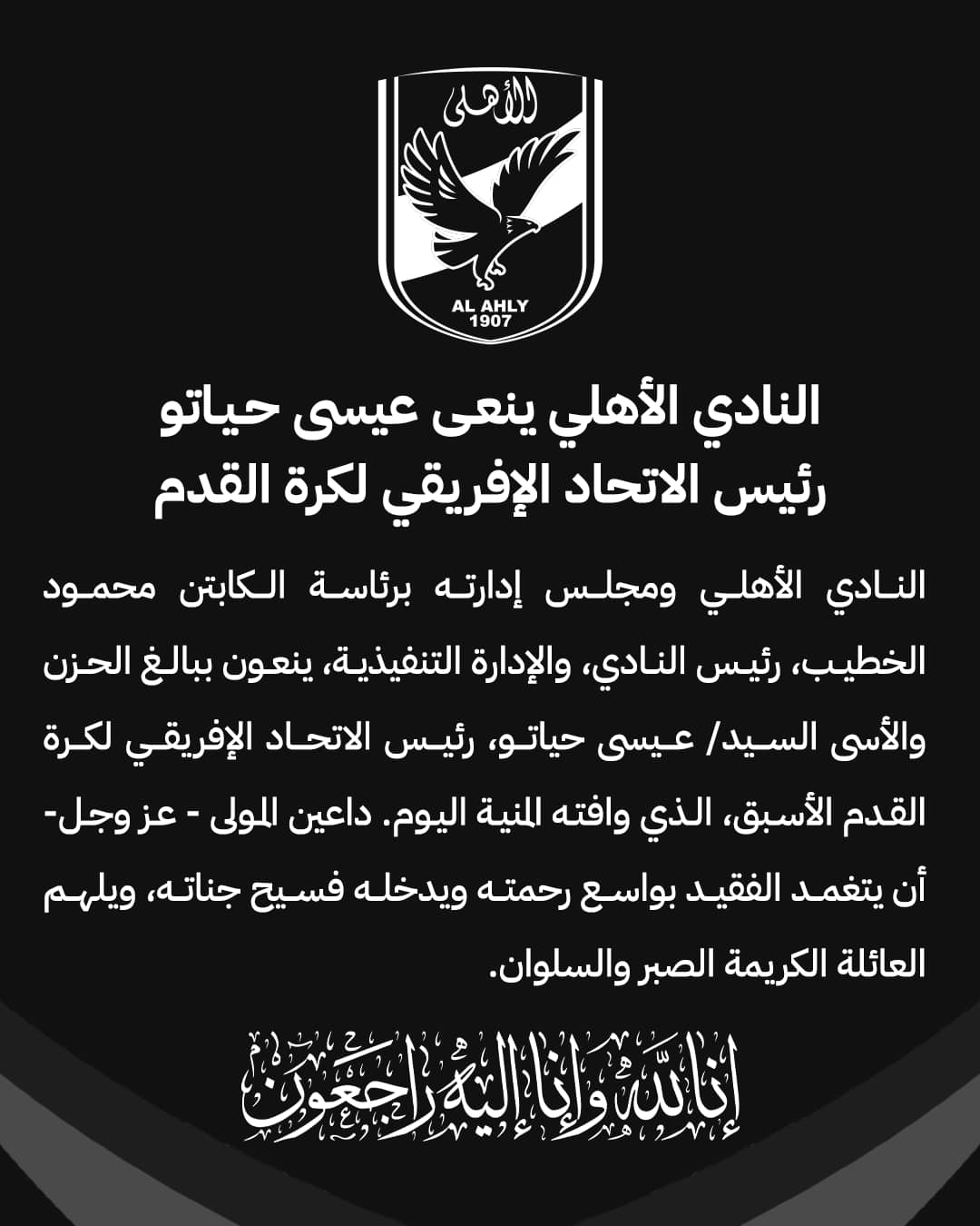 نعى النادي الأهلي ومجلس إدارته برئاسة الكابتن محمود الخطيب، رئيس النادي، والإدارة التنفيذية، ببالغ الحزن والأسى عيسى حياتو، رئيس الاتحاد الإفريقي لكرة القدم الأسبق، الذي وافته المنية، داعين المولى - عز وجل أن يتغمد الفقيد بواسع رحمته ويدخله فسيح جناته، ويلهم العائلة الكريمة الصبر والسلوان.