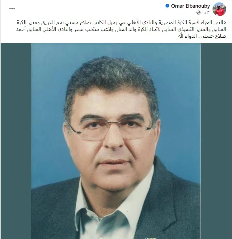 تشيع اليوم جنازة الكابتن صلاح حسني نجم النادي الأهلي، ومدير الكرة، والمدير التنفيذي السابق للفريق، والد النجم أحمد صلاح حسني، والذى رحل عن عالمنا خلال الساعات الماضية.