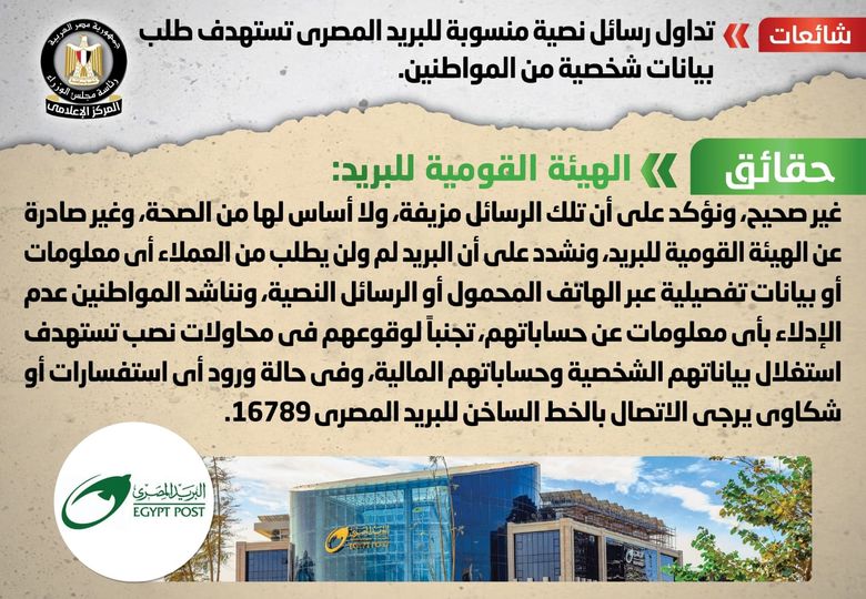 تواصل المركز الإعلامي لمجلس الوزراء مع الهيئة القومية للبريد، والتي نفت تلك الأنباء، مُؤكدةً أنه لا صحة لإرسال البريد المصري أي رسائل تستهدف طلب أي بيانات من المواطنين تخص حساباتهم أو عناوينهم أو أي بيانات أخرى بزعم دفع تكاليف الشحن، وأن تلك الرسائل مزيفة، ولا أساس لها من الصحة، وغير صادرة عن الهيئة القومية للبريد، مُشددةً على أن البريد لم ولن يطلب من العملاء أي معلومات أو بيانات تفصيلية عبر الهاتف المحمول أو الرسائل النصية، مُناشدةً المواطنين عدم الإدلاء بأي معلومات عن حساباتهم، تجنباً لوقوعهم في محاولات نصب تستهدف استغلال بياناتهم الشخصية وحساباتهم المالية، وفي حالة ورود أي استفسارات أو شكاوى يرجى الاتصال بالخط الساخن للبريد المصري 16789.