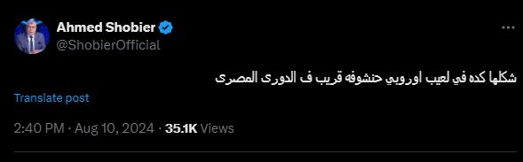 وكتب شوبير عبر حساباته على مواقع التواصل الاجتماعي:، “شكلها كده في لعيب أوروبي حنشوفه قريبًا في الدورى المصرى”، دون الكشف عن اسم اللاعب.