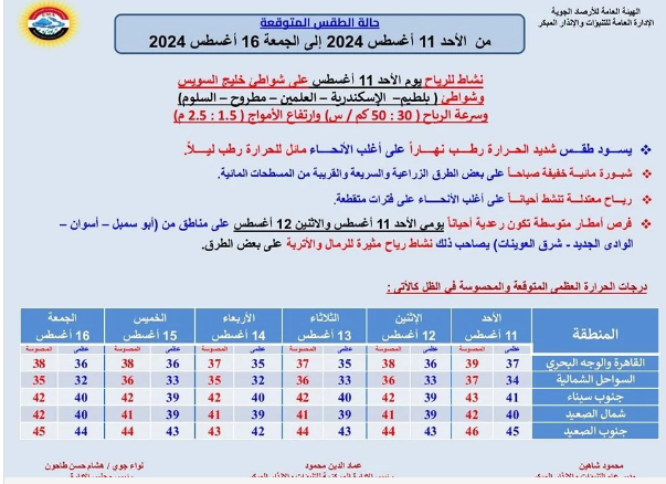 يتوقع خبراء هيئة الأرصاد الجوية أن يسود اليوم طقس شديد الحرارة رطب نهارًا على القاهرة الكبرى والوجه البحري وجنوب سيناء وجنوب البلاد، حار رطب على السواحل الشمالية.. بينما يسود طقس مائل للحرارة رطب ليلًا على أغلب الأنحاء، معتدل الحرارة رطب على السواحل الشمالية.