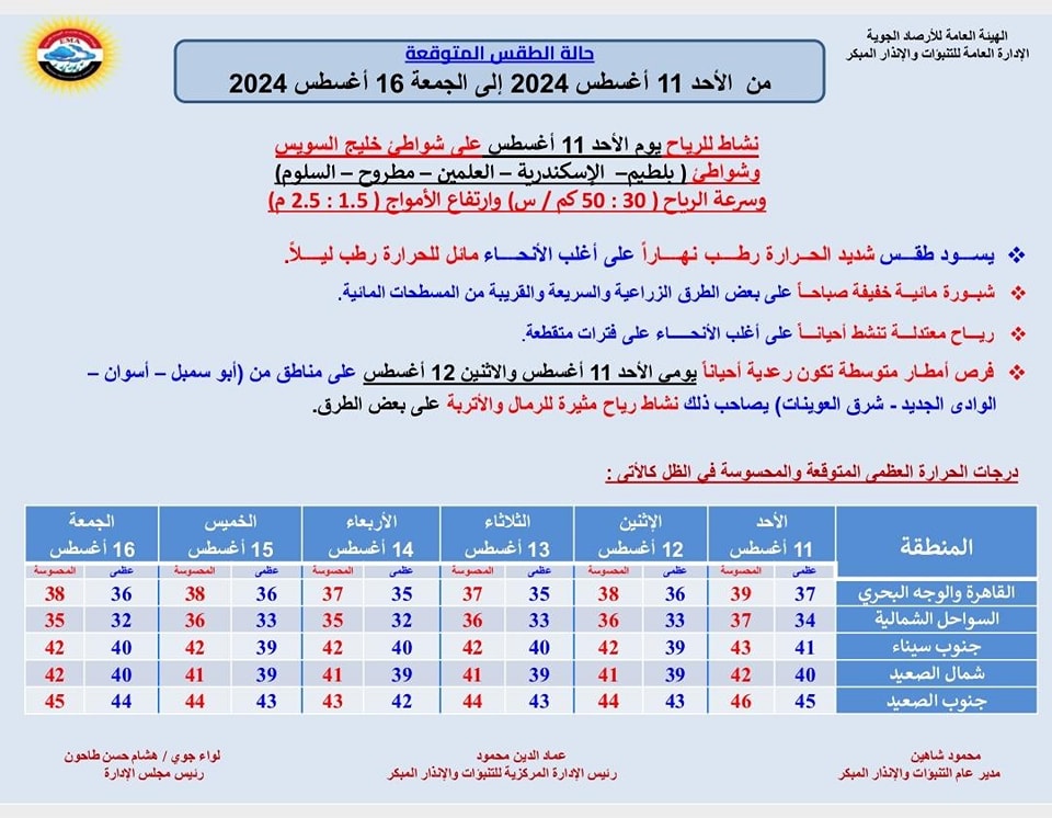 وفيما يأتي بيان بدرجات الحرارة المتوقعة على محافظات ومدن مصر: