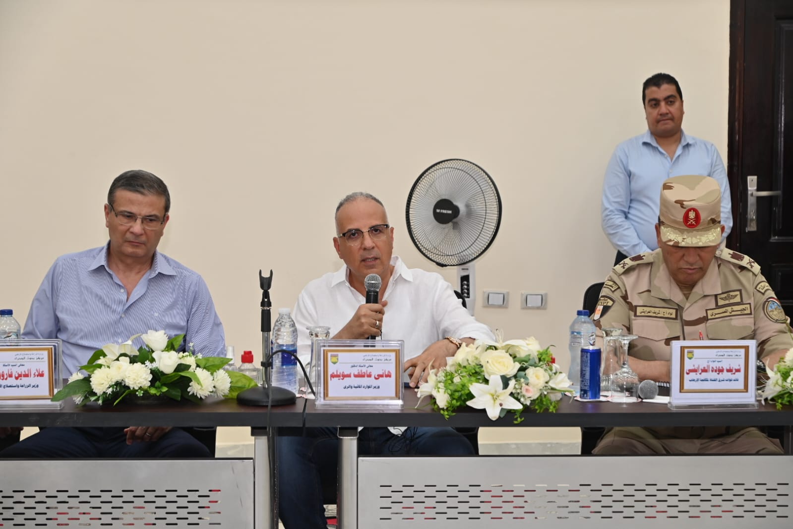 واستقبل الوزيرين اللواء خالد مجاور محافظ شمال سيناء الذى أعرب عن ترحيبه بهما ، والتأكيد على حرصه على التعاون معهما فيما يخدم المنظومتين المائية والزراعية بالمحافظة.