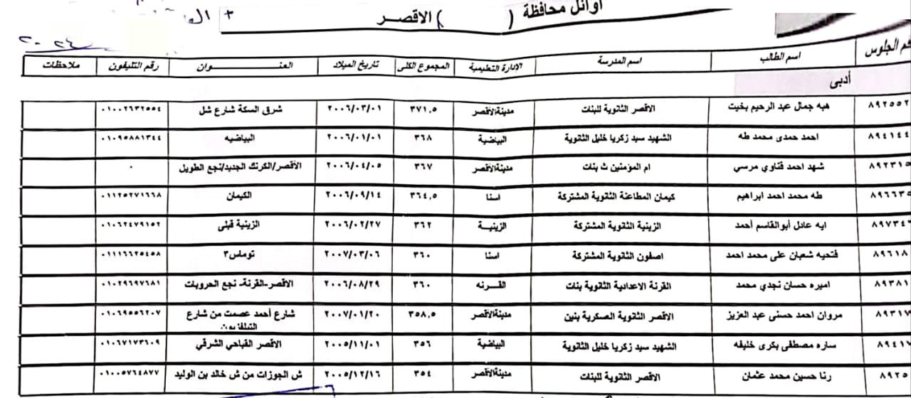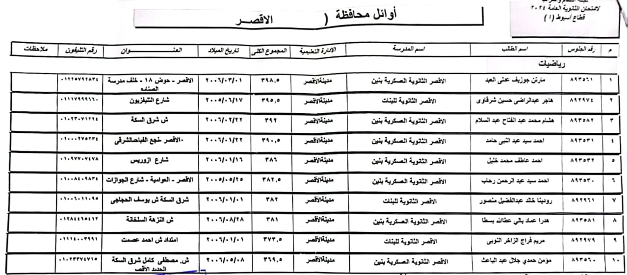الأقصر تعلن قائمة أوائل الثانوية العامة على مستوى المحافظة