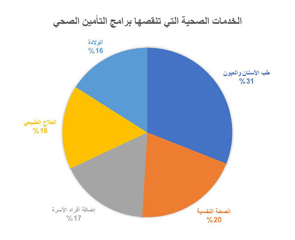وعندما سُئِل الموظفون عن أبرز الخدمات الصحية التى تنقصها برامج التأمين الصحى الخاصة بهم، كانت أبرز الإجابات هي: خدمات العيون وطب الأسنان (31٪)، الصحة النفسية (20٪)، إضافة أفراد الأسرة (17٪)، العلاج الطبيعى (16٪)، والولادة (16).