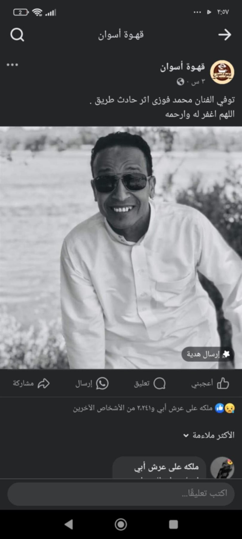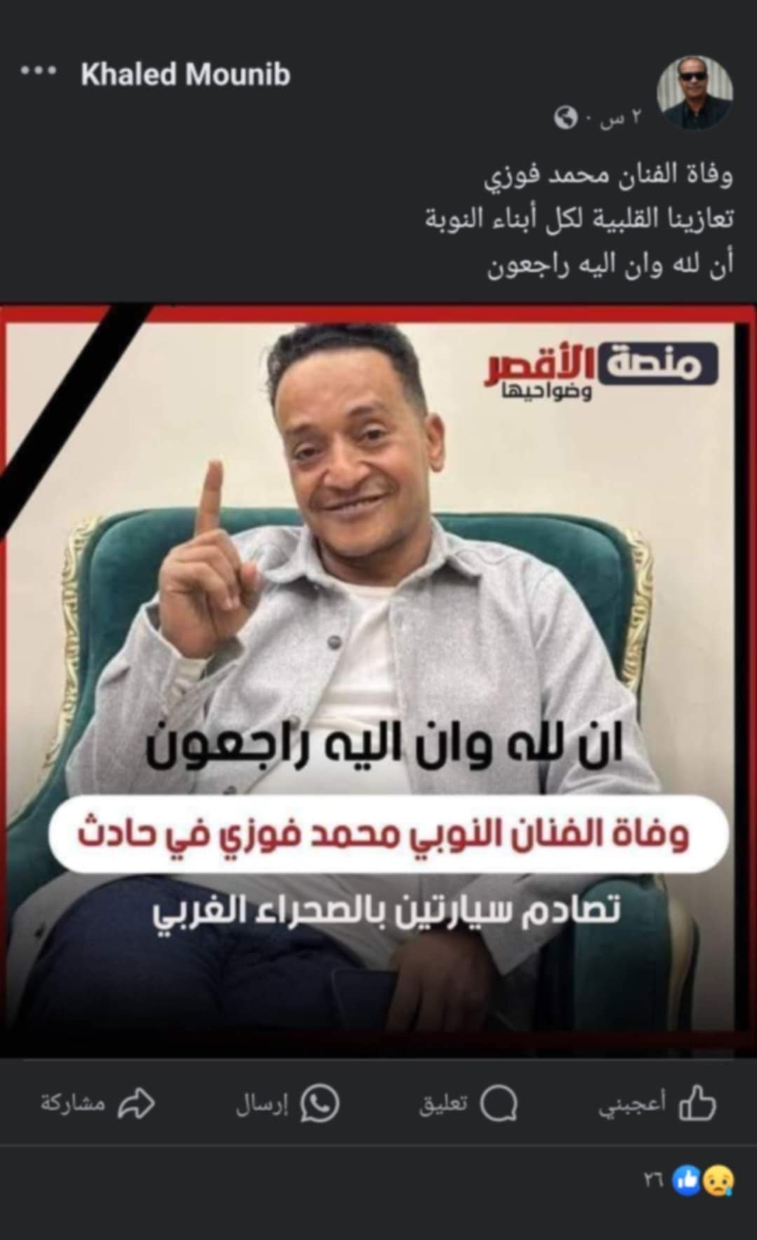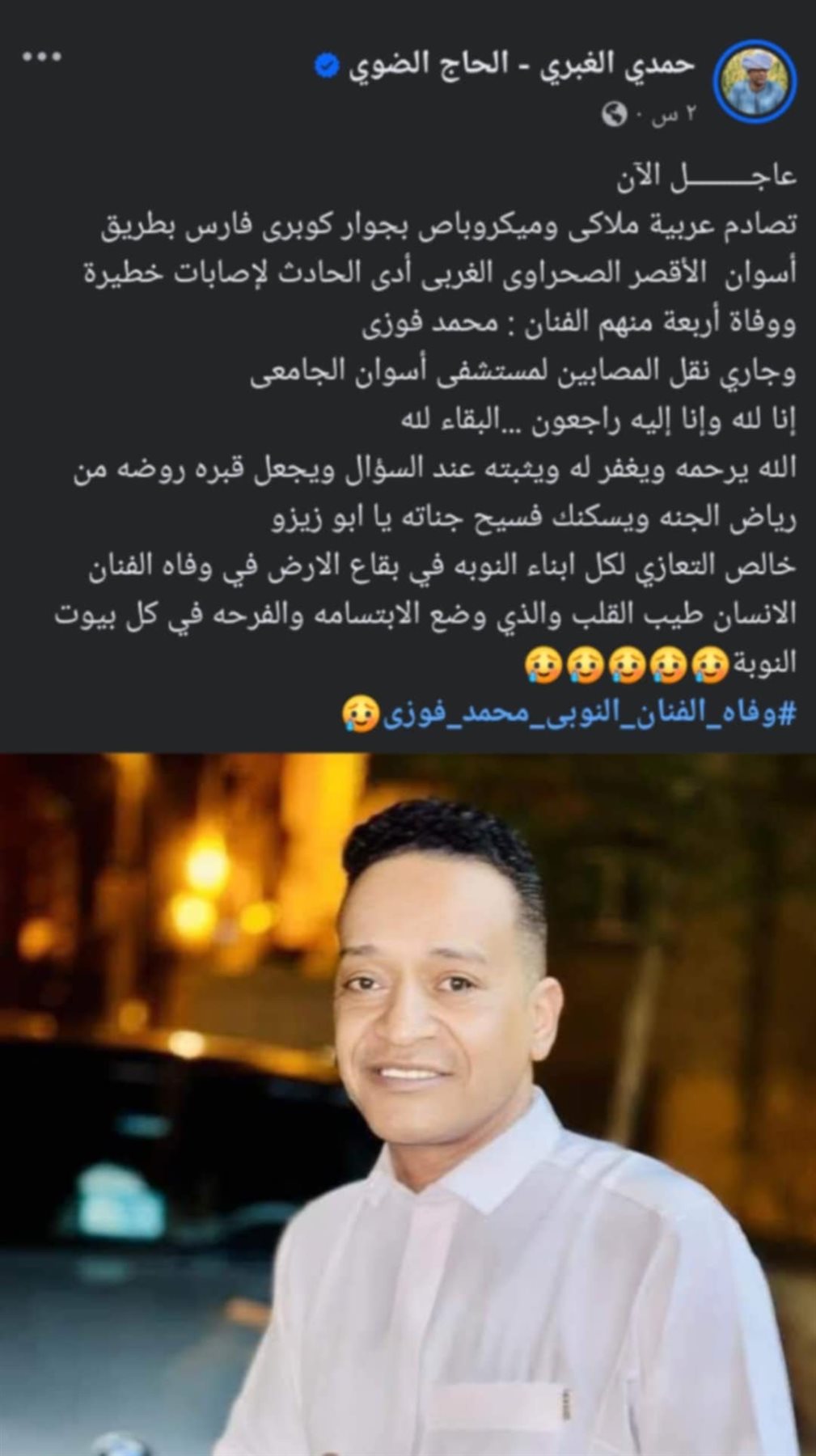 سيطرت حالة كبيرة من الحزن على منصات التواصل الاجتماعي《فيس بوك واكس》، عقب انتشار خبر مصرع الفنان النوبي محمد فوزي في حادث تصادم بطريق أسوان الغربي.