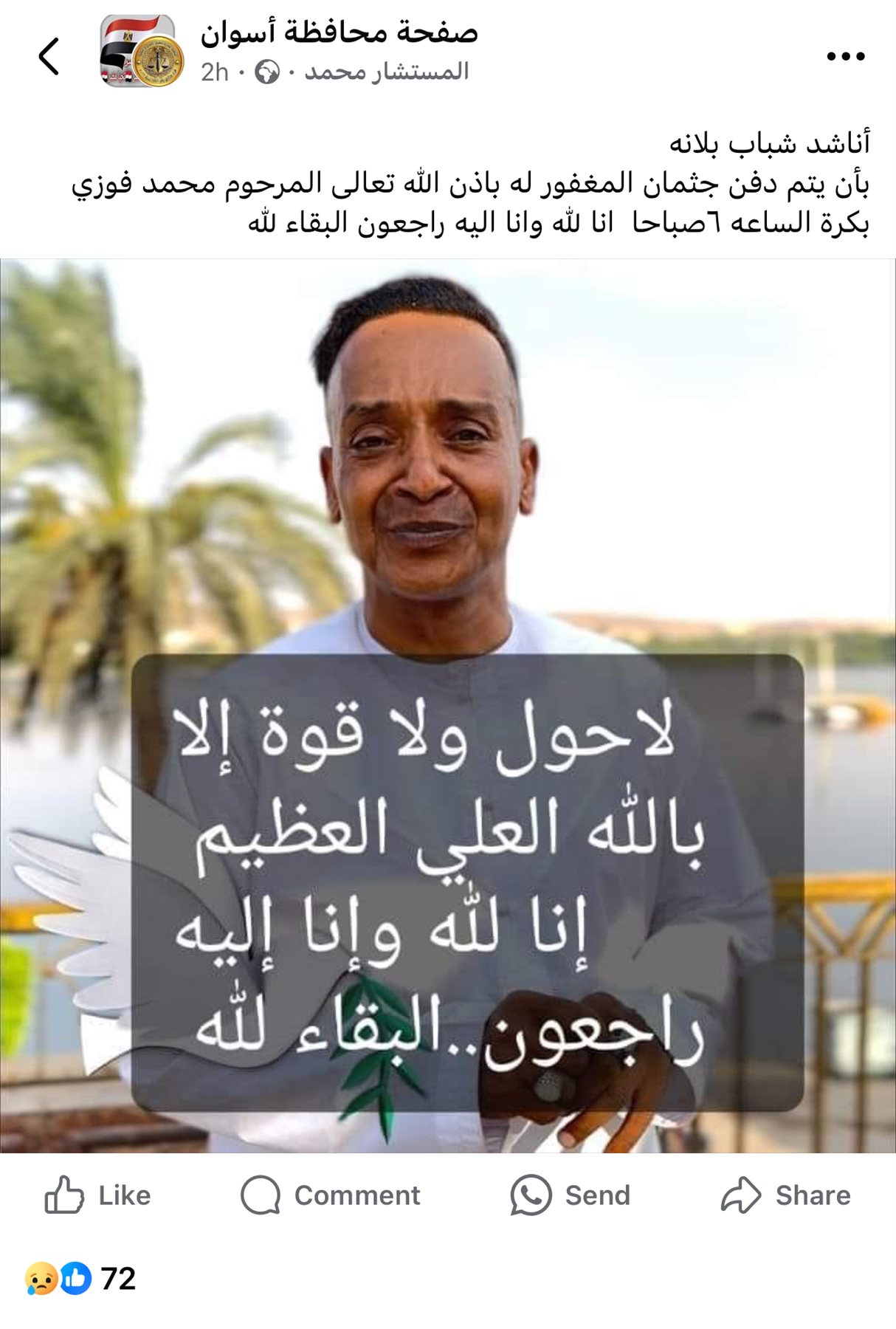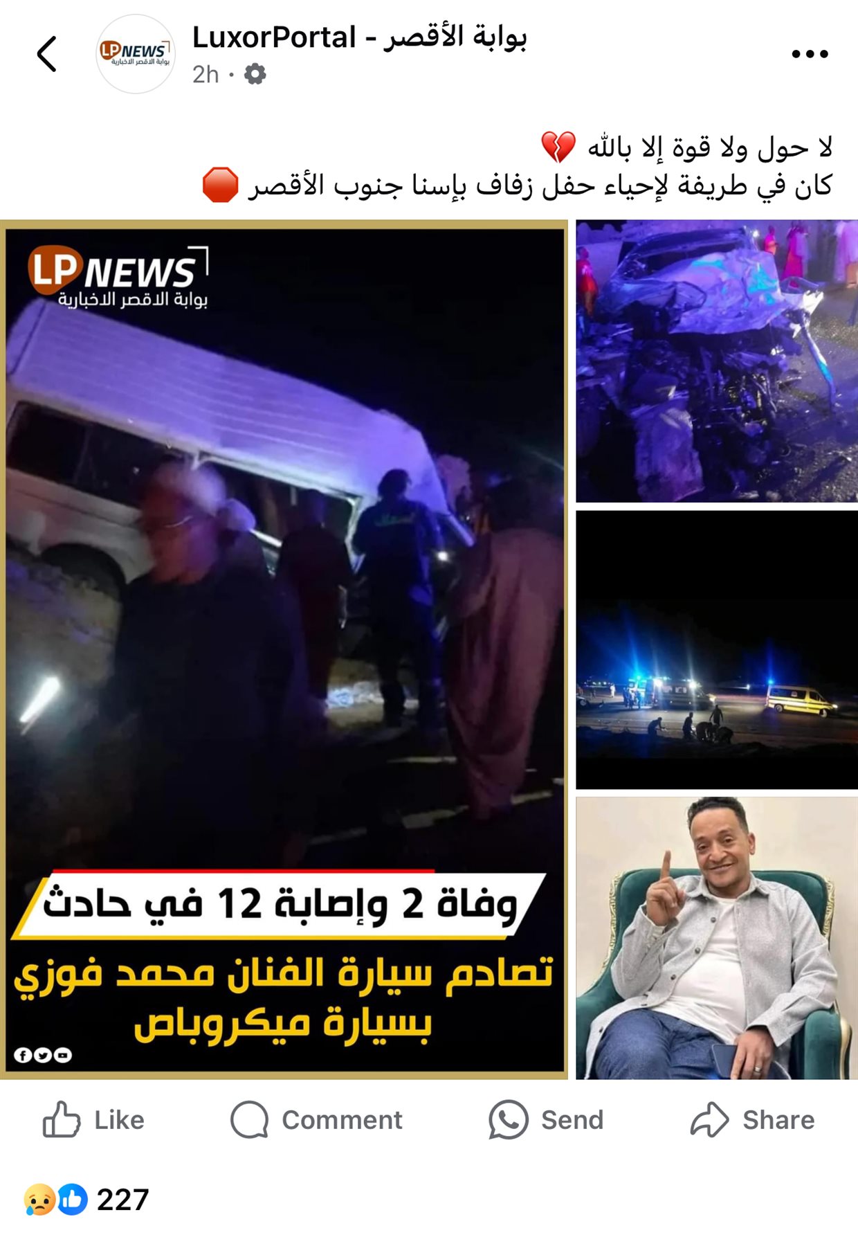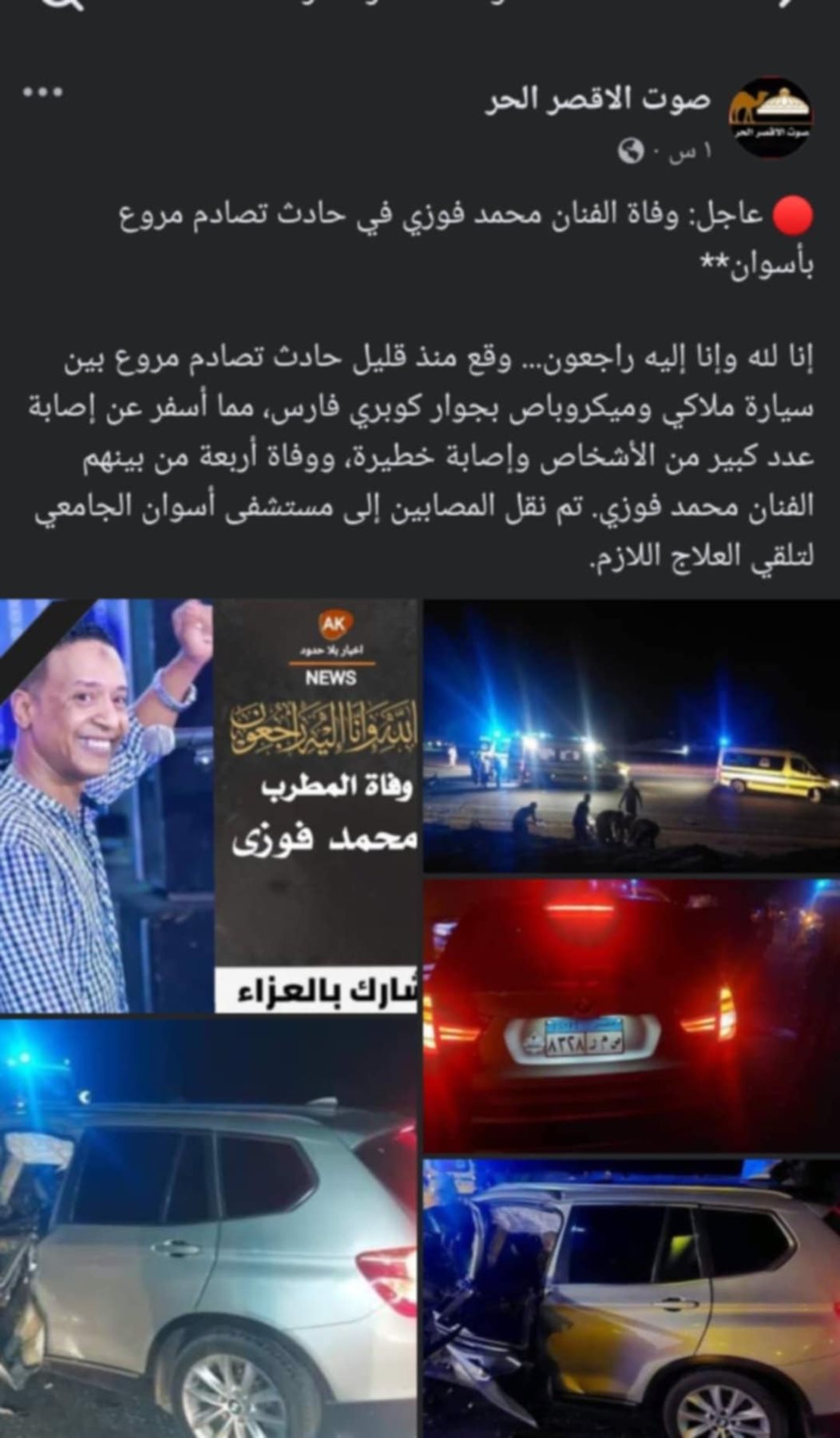 سيطرت حالة كبيرة من الحزن على منصات التواصل الاجتماعي《فيس بوك واكس》، عقب انتشار خبر مصرع الفنان النوبي محمد فوزي في حادث تصادم بطريق أسوان الغربي.
