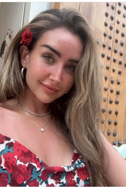 وزينت خصلات شعرها بزهرة حمراء ناعمة ولم تتكلف بوضع المكياج لتبرز سحر ملامحها بشكل ناعم وجذاب مع لون الكشمير الفاتح في الشفاه.