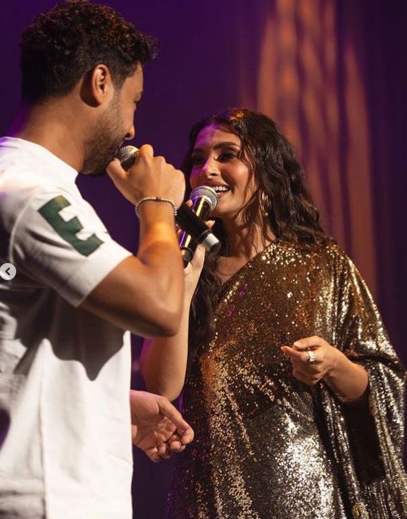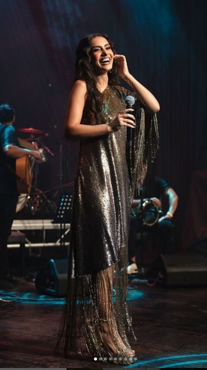 وبدت كارمن سليمان بإطلالة متوهجة، حيث ارتدت فستان طويل فضفاض، ينتمي لقصة ألوان شولدر، صمم من قماش البايت الناعم باللون الفضي، وزين الفستان بالشراشيب من الأطراف، الفستان حمل توقيع علامة SemSem، فيما انتعلت صندلا بكعب عال.