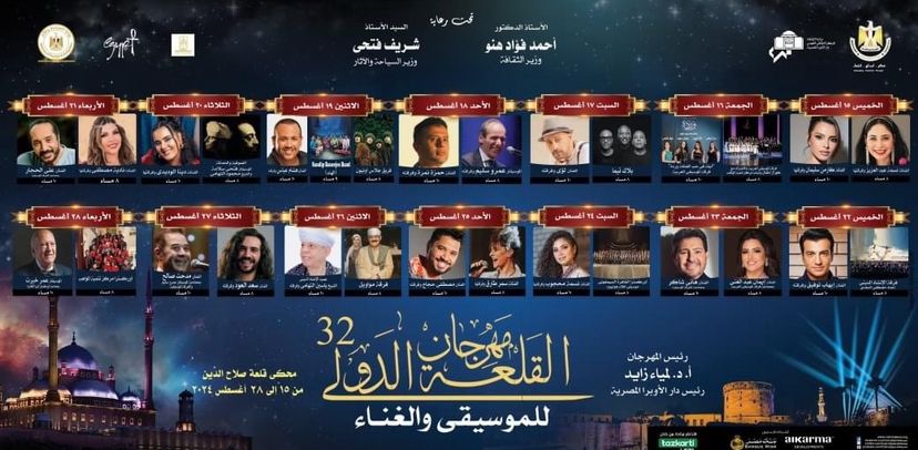 يذكر ان الدورة ٣٢ من مهرجان قلعة صلاح الدين الدولى للموسيقى والغناء، تتواصل على مدار ١٤ يوم وتقام فى الفترة من الخميس ١٥ اغسطس حتى الأربعاء ٢٨ أغسطس، وتضم ٣١ حفل متنوع على مسرح المحكى