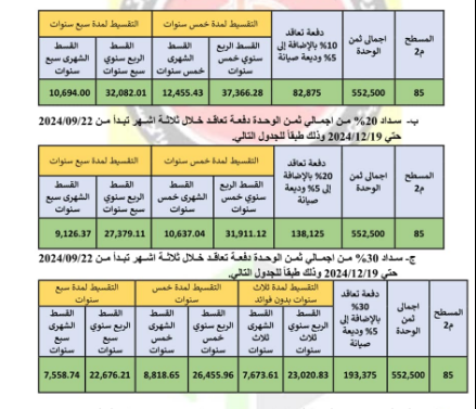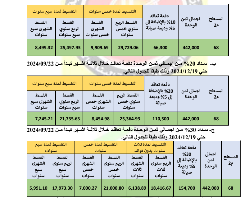 - استكمال سداد 20%، بالإضافة إلى %1 مصاريف إدارية من إجمالى ثمن الوحدة خلال شهر يبدأ من 2024/08/18 حتى 2024/09/19.