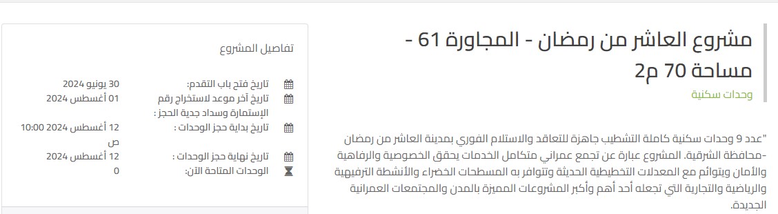 ومن المقرر أن تستكمل الهيئة العامة لتعاونيات البناء والإسكان، غدًا الثلاثاء، الحجز الإلكتروني، لعدد 10 وحدات سكنية مطروحة بالمجاورة 61، بمدينة العاشر من رمضان بمساحة 84 مترًا.
