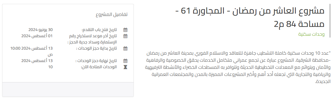 تستعد الهيئة العامة لتعاونيات البناء والإسكان، بالتعاون مع بنك التعمير والإسكان، غدًا الثلاثاء، لفتح باب الحجز الإلكتروني لـ 10 وحدات سكنية كاملة التشطيب جاهزة للتعاقد والاستلام الفوري بمدينة العاشر من رمضان، بمساحة 84 مترًا.
