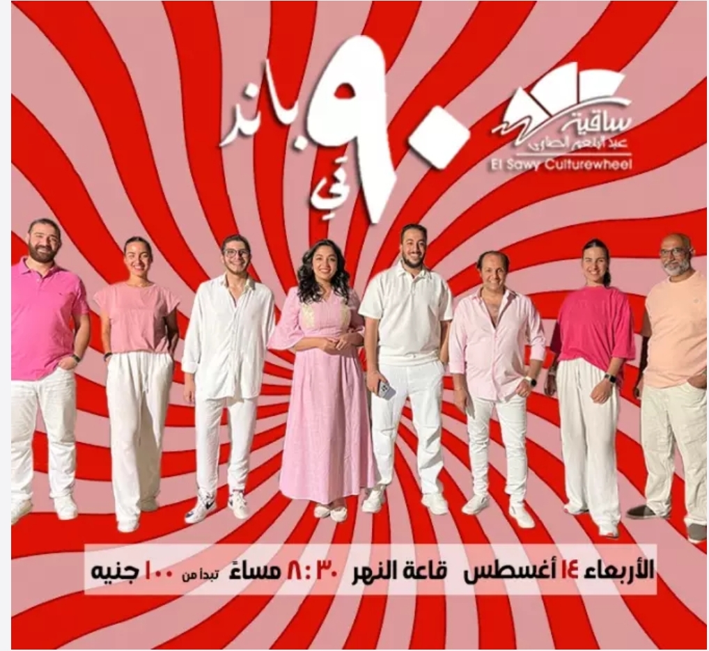 تستقبل ساقية الصاوي، حفل غنائي لفرقة باند 90، وذلك يوم الاربعاء المقبل، في تمام الساعة الثامنة ونصف مساء، بقاعة النهر وسعر التذكرة 100 جنيه.