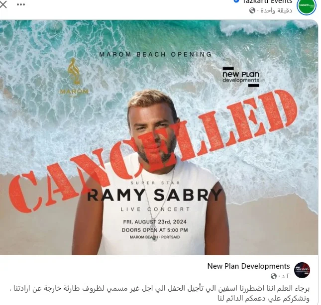 أعلنت الشركة المنظمة لحفل النجم رامي صبري، عن تأجيل الحفل المقرر إطلاقه في بورسعيد، الموافق يوم 23 من الشهر الجاري، دون الكشف عن مبررات واضحة للجمهور.