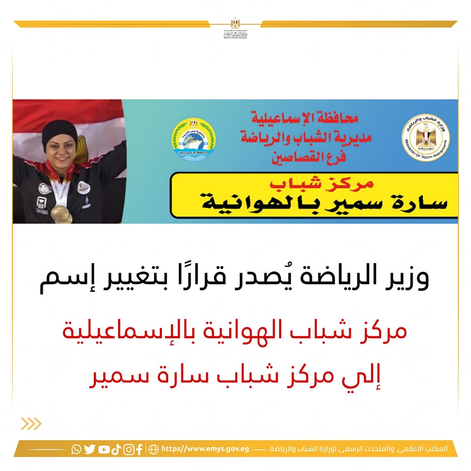 أصدر دكتور أشرف صبحي، وزير الشباب والرياضة؛ قرارًا بالموافقة علي إطلاق اسم سارة سمير، صاحبة الميدالية الفضية في أولمبياد باريس 2024، على مركز شباب الهواينة بالإسماعيلية، حيث كانت تتدرب في المركز.
