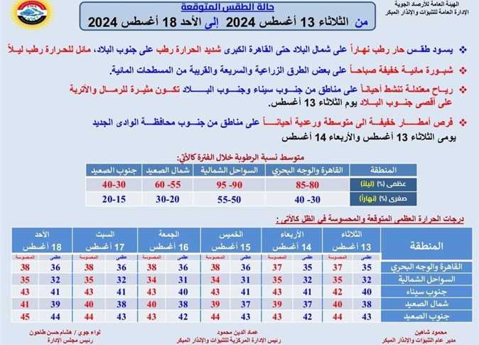 حالة الطقس.. كشفت الهيئة العامة للأرصاد الجوية عن حالة الطقس المتوقعة على كافة الأنحاء، ويسود طقس حار رطب نهارًا على شمال البلاد حتى القاهرة الكبرى، شديد الحرارة رطب على جنوب البلاد.