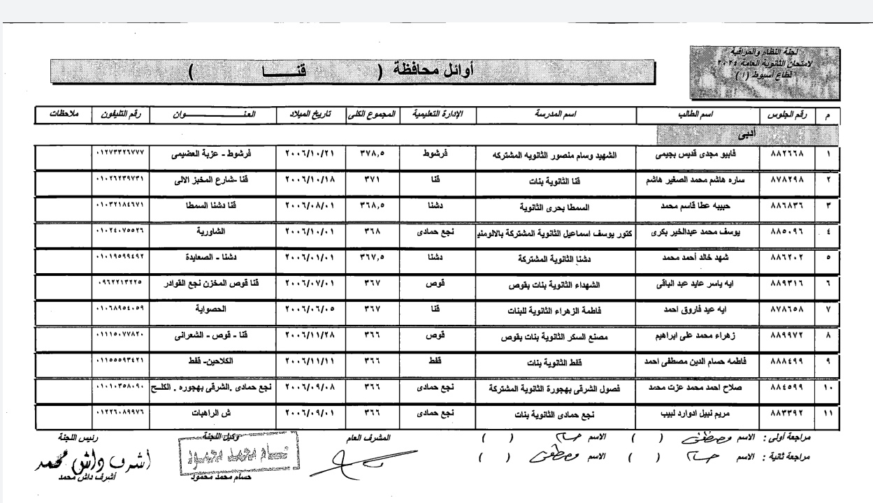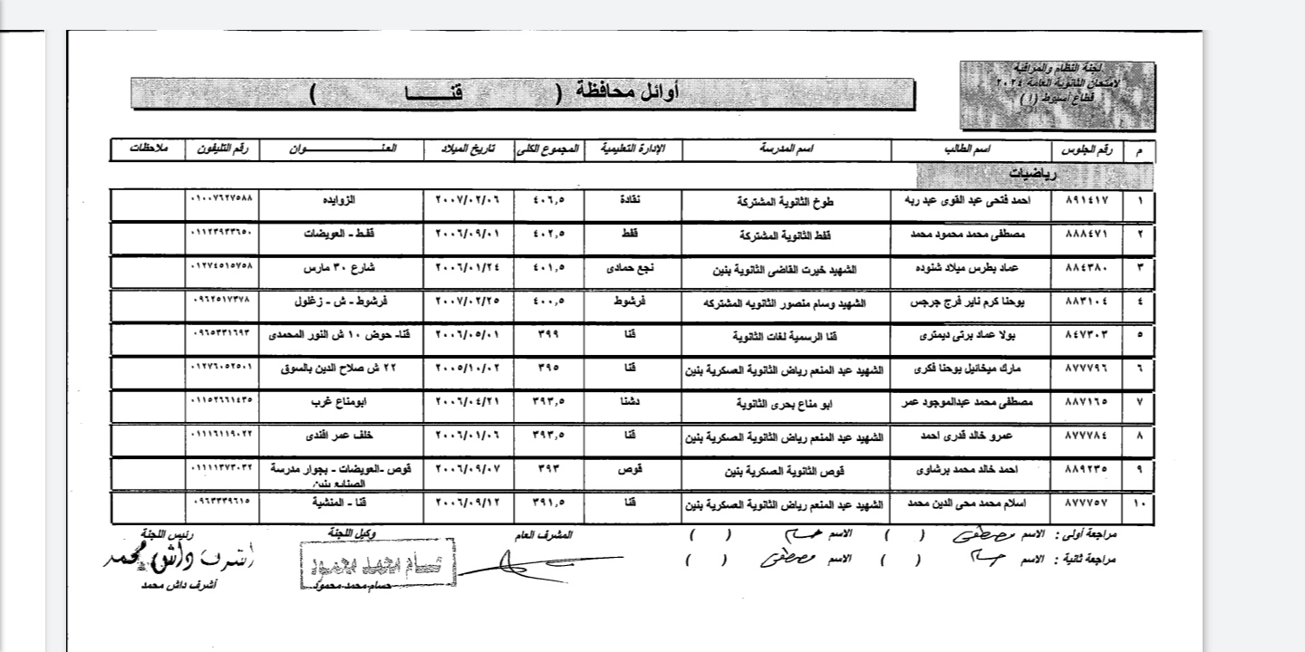 بعد تعديل النتيجة ننشر أوائل الثانوية العامة بقنا