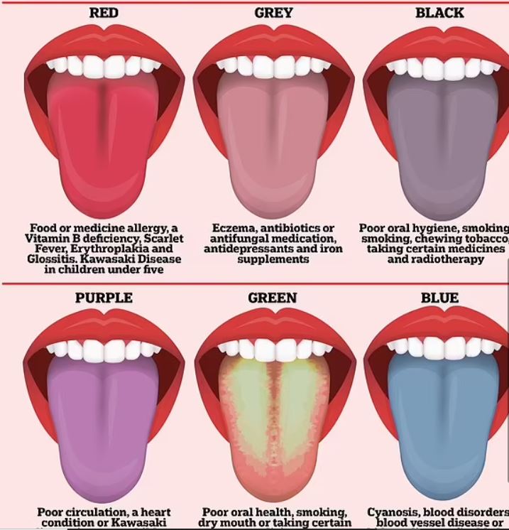 وأردف الناجي: "عادةً ما يكون لسان مرضى السكري أصفر للون؛ ومرضى السرطان لسان أرجواني مع طبقة دهنية سميكة؛ ومرضى السكتة الدماغية الحادة لسان أحمر غير عادي الشكل، بينما يشير اللسان الأبيض إلى فقر الدم؛ ومن المرجح أن يكون لدى الأشخاص المصابين بحالات شديدة من كوفيد-19 لسان أحمر غامق؛ ويشير اللسان النيلي أو البنفسجي إلى مشاكل في الأوعية الدموية والجهاز الهضمي أو الربو."