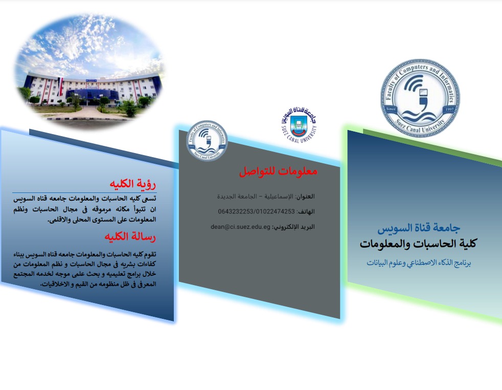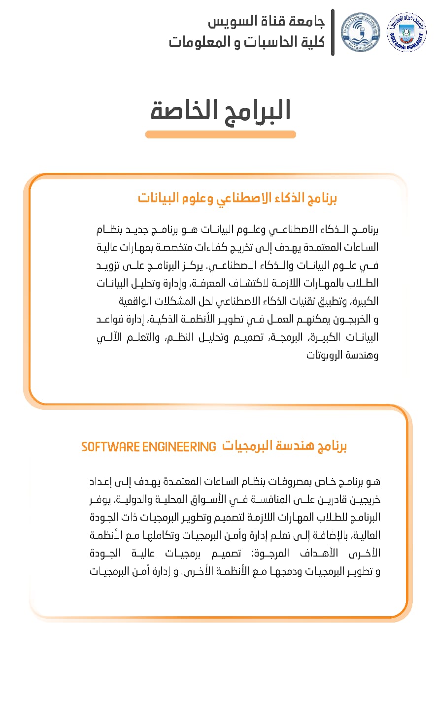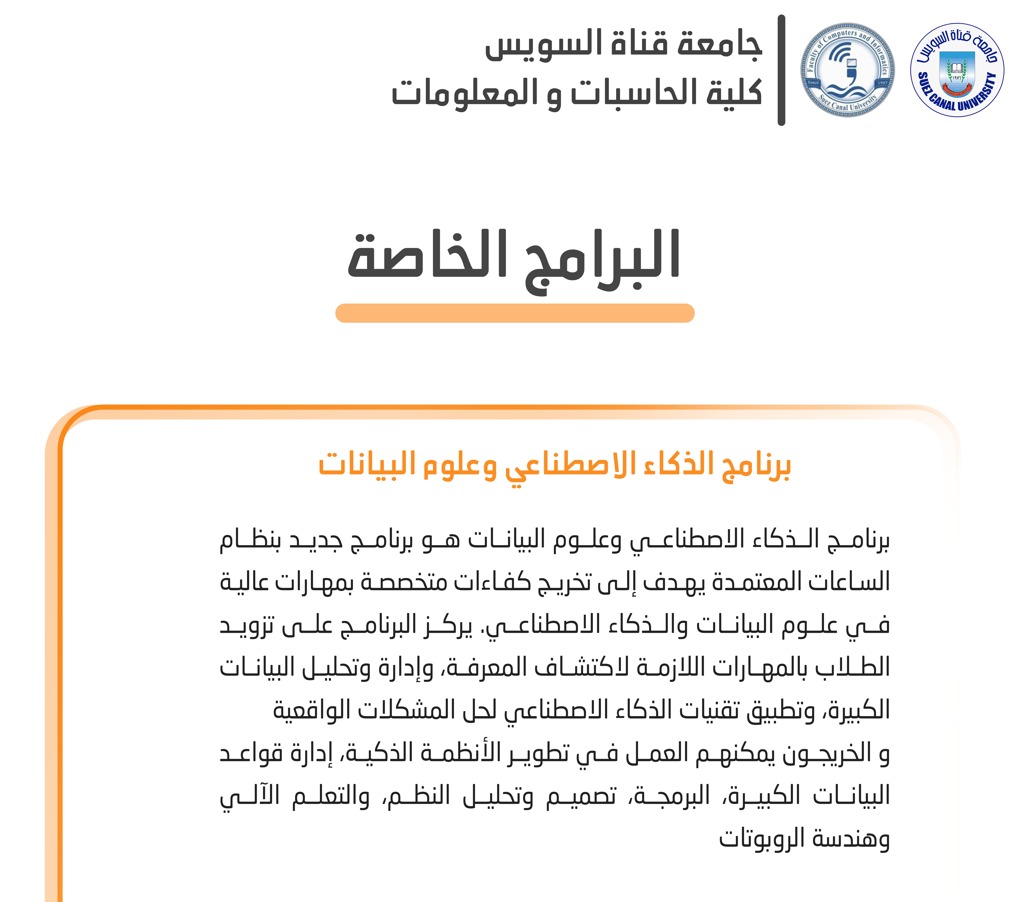 قال الدكتور ناصر مندور رئيس جامعة قناة السويس، إن كلية الحاسبات والمعلومات بالإسماعيلية تقدم ثلاثة برامج حديثة للطلاب الجُدد تهدف إلى مواكبة توجهات سوق العمل والتطور التكنولوجي الحديث تشمل برنامج الذكاء الاصطناعي وعلوم البيانات، برنامج هندسة البرمجيات، برنامج الحوسبة والمعلوماتية الحيوية.