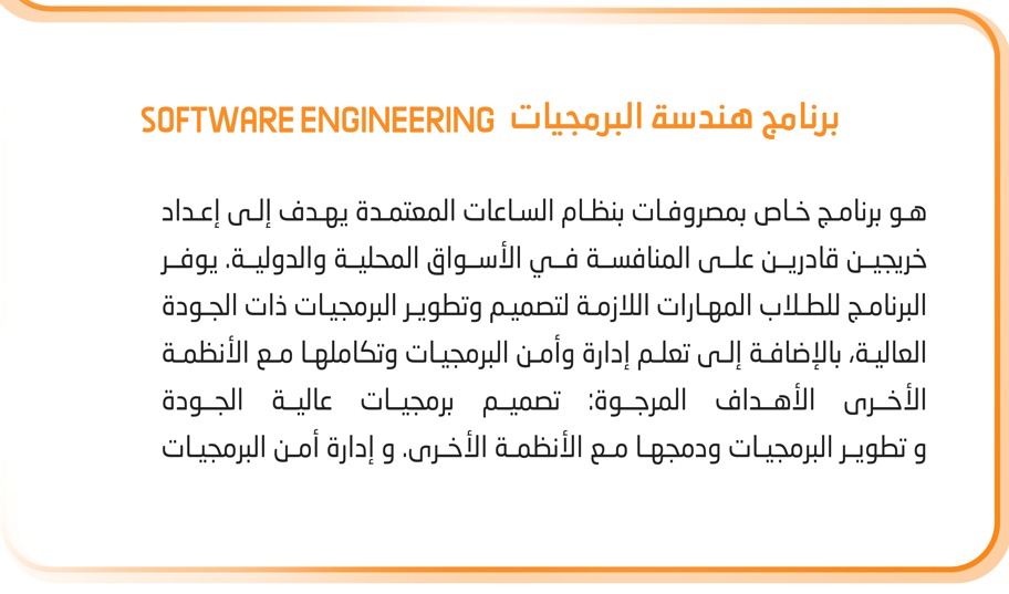 أما عن برنامج هندسة البرمجيات - فأشار نائب رئيس الجامعة لشئون التعليم والطلاب إلى أن البرنامج يعد برنامج خاص بمصروفات بنظام الساعات المعتمده يعمل على تنمية قدرات و مهارات الطلاب في تصميم و تطوير مشروعات البرمجيات و كيفية هيكلة الأنظمة البرمجية و طرق إعادة استخدمها.