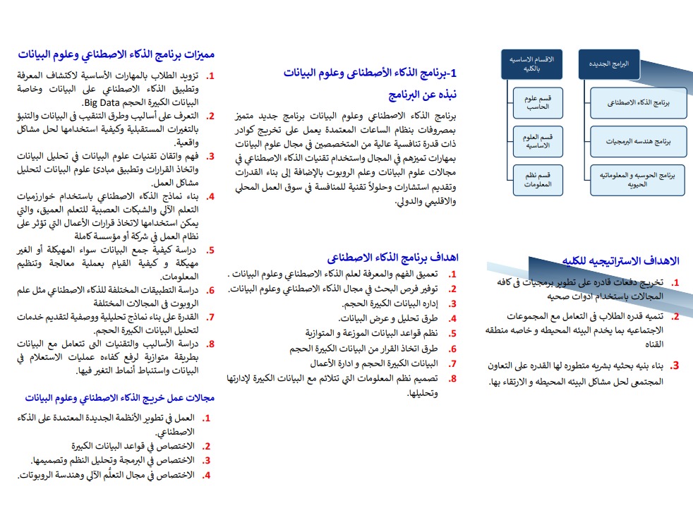 كما حرصت الدكتور غادة الطويل وكيل الكلية لشئون التعليم والطلاب على توضيح مجالات العمل في برنامج الذكاء الاصطناعي وعلوم البيانات، والتي تشمل العمل في تطوير الأنظمة الجديدة المعتمدة على الذكاء الاصطناعي ، الاختصاص في قواعد البيانات الكبيرة، الاختصاص في البرمجة وتحليل النظم وتصميمها، والاختصاص في التعلم الآلي وهندسة الروبوتات.