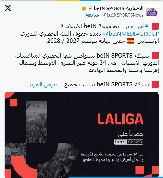 ونشرت شبكة beIN القطرية بيانًا عبر موقعها الإلكتروني، أكدت خلاله مواصلة امتلاكها لحقوق البث الحصري لبطولة الدوري الإسباني في 34 دولة في منطقة الشرق الأوسط، شمال أفريقيا، آسيا، المحيط الهادئ، حتى نهاية موسم 2027-2028.