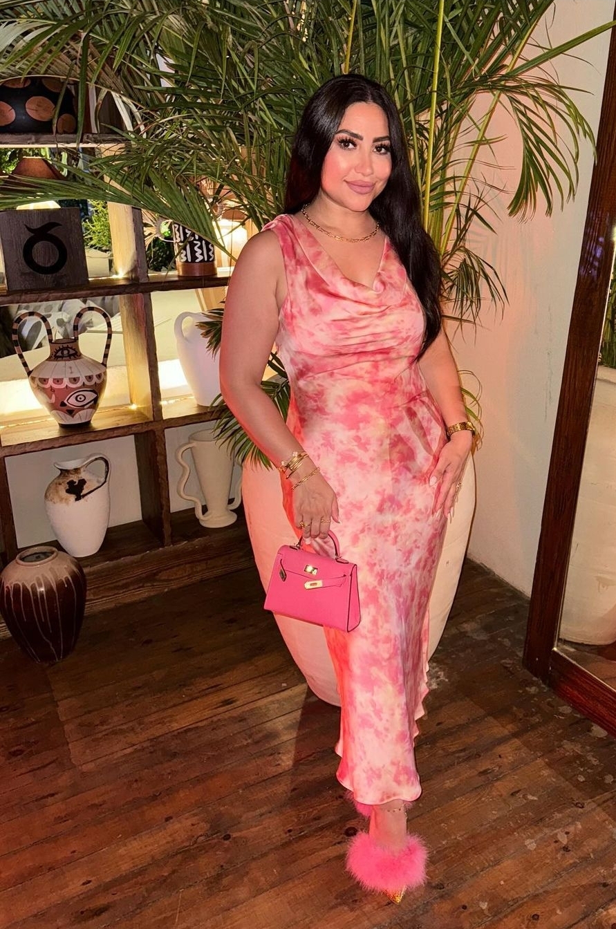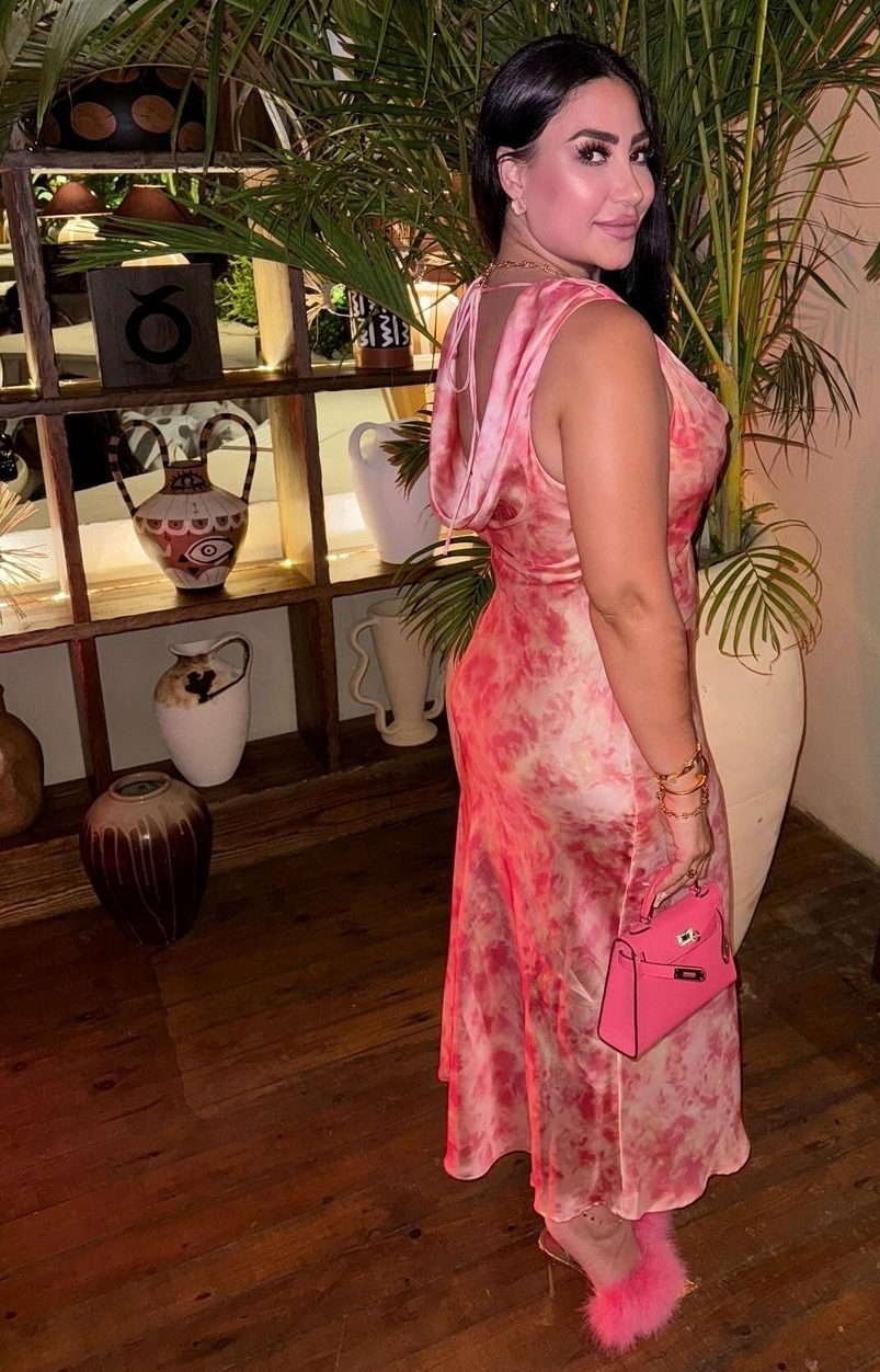 وبدت بوسي بإطلالة صيفية جذابة، جعلتها تبدو مثل الزهرة في بستان الزهور، حيث ارتدت فستان طويل مجسم، بدون أكمام، صمم الفستان من قماش اللاميه بالألوان الطبيعية، حيث ارتدت حذاء بكعب عال مزين بالريش باللون  الفوشيا لتخطف الأنظار من جديد لها وهي تواكب احدث صيحات موضة احذية 2024.