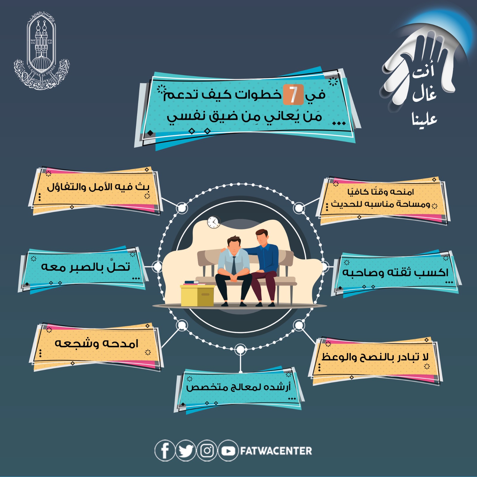 قام مركز الأزهر العالمي للفتوى الإلكترونية ضمن حملة “أنت غال علينا" بتقديم 7 خطوات لدعم من يُعاني من ضيق نفسي، وذلك من قبيل التوعية لكل من يتعامل مع من يعانون من القلق النفسي من الأصدقاء والأهل والزملاء، لنقدم لهم يد المساعدة في أوقاتهم الصعبة، ومن هنا تستقيم أمورهم ونحد من انتشار القلق والاكتئاب برفع الوعي المجتمعي.