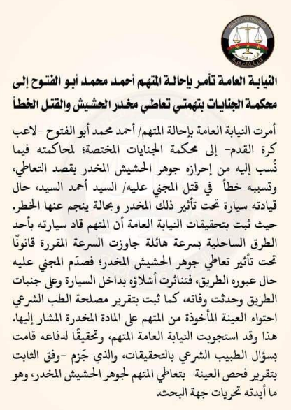 أصدرت النيابة العامة قرارًا بإحالة أحمد فتوح، نجم فريق الزمالك الأول لكرة القدم، إلى محكمة الجنايات بتهمة القتل الخطأ وتعاطي مخدر الحشيش.