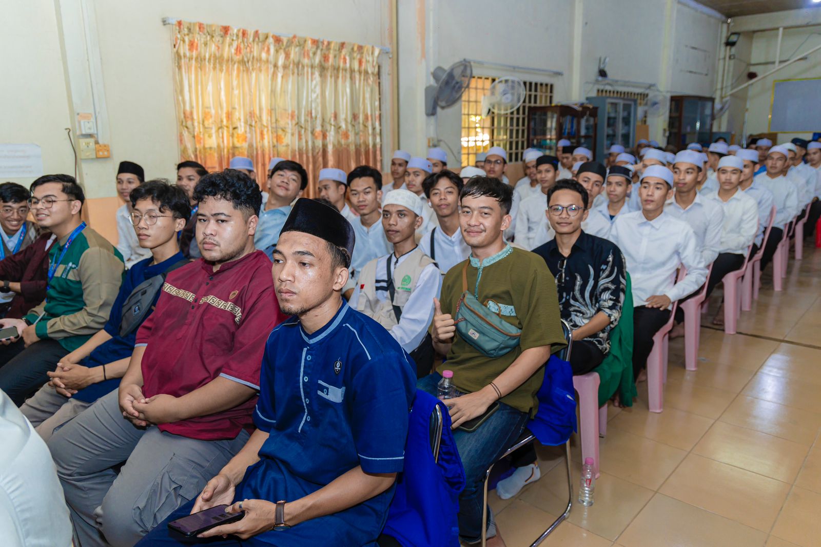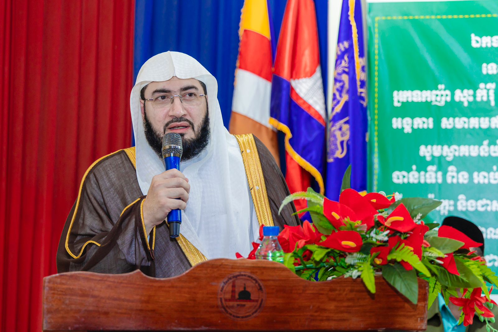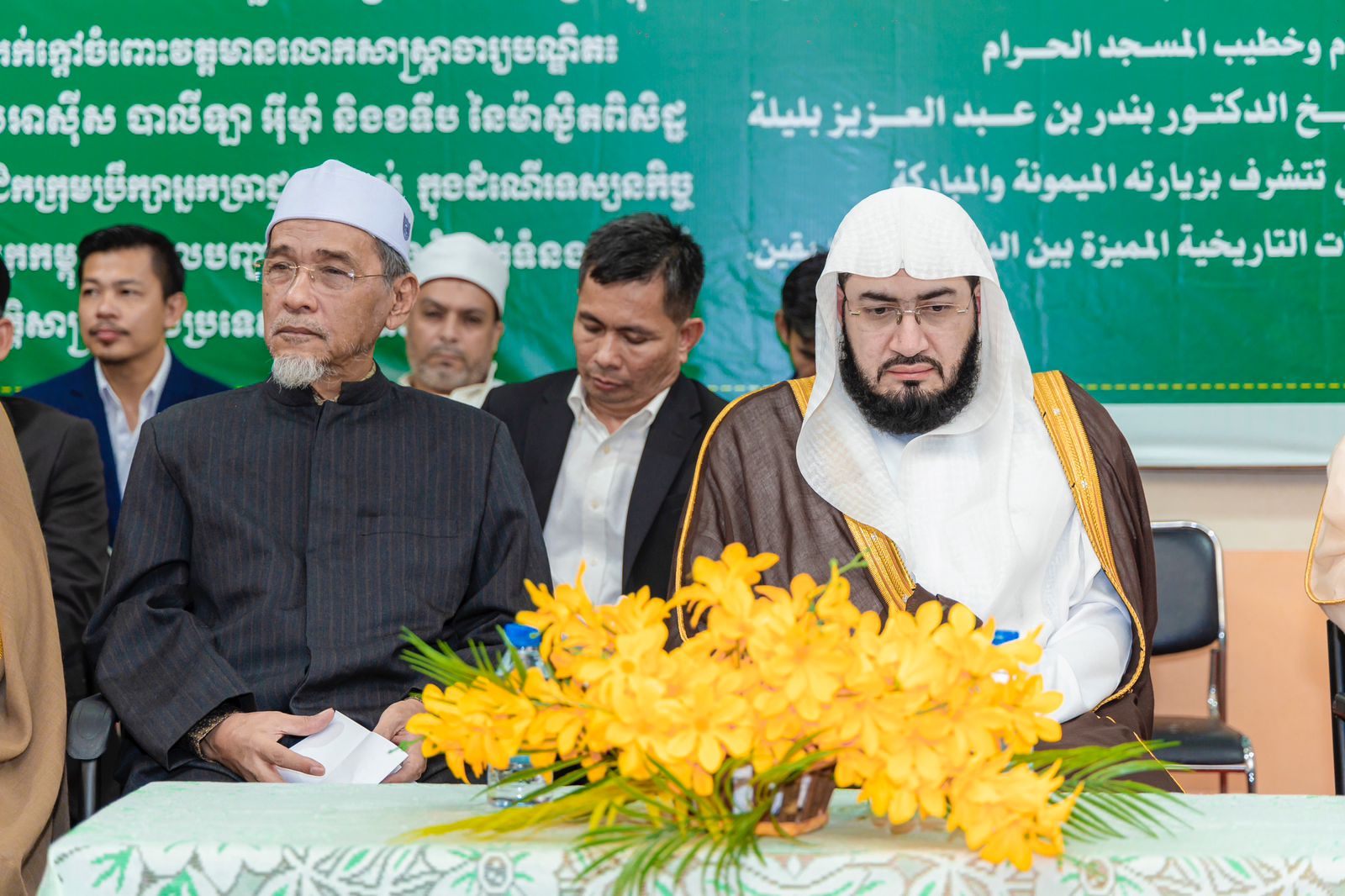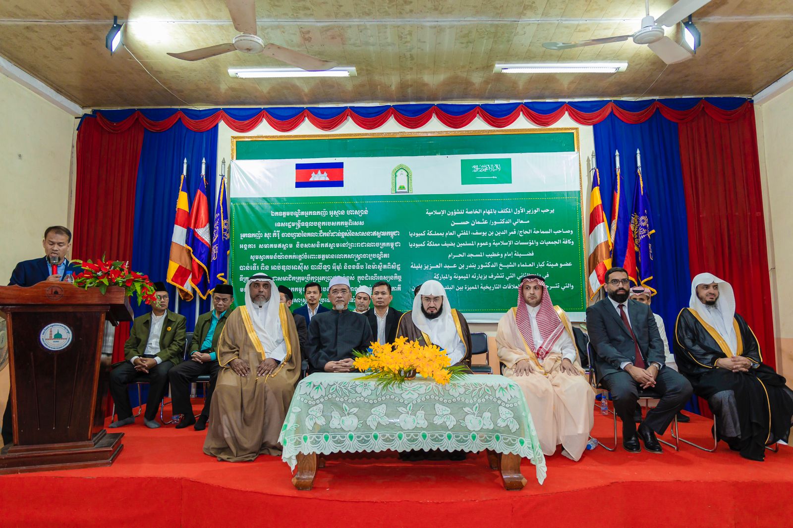 وبحضور سفير خادم الحرمين الشريفين لدى كمبوديا الأستاذ محمد بن أسماعيل الدهلوي وأعضاء المجلس وعدد من الطلاب والطالبات بالمدارس الشرعية التي يشرف عليها المجلس، أقيم حفل خطابي بهذه المناسبة استهل بتلاوة آيات من الذكر الحكيم ثم ألقى فضيلة المفتي العام كلمة رحب فيها بزيارة إمام الحرم والتي وصفها بالتاريخية وتتويجاً لمستوى العلاقات المتميزة بين البلدين الصديقين.