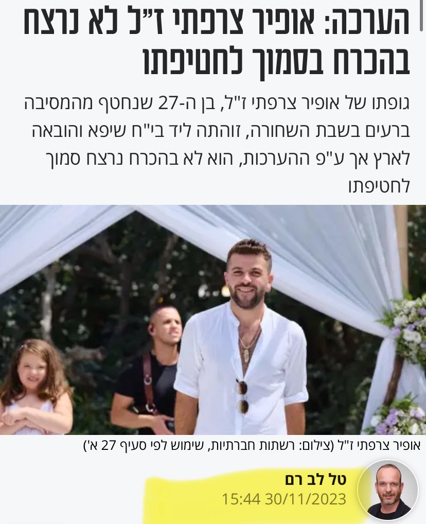 الجندي الأسير لدى حماس، الذي قُتل هو أوفير سرفاتي، اعتقلته المقاومة في السابع من أكتوبر في منطقة غلاف غزة، ولكن المثير في الأمر أن الجيش الإسرائيلي أعلن في نهاية نوفمبر 2023 عن العثور على جثته، في محيط مستشفى الشفاء، وتم نقلها إلى عائلته لدفنها، وتأكدت عائلة الجندي من أن الجثمان يعود لابنهم والذي نشرت المقاومة الفلسطينية صورته في ذلك الوقت، وكان لصورة الجندي الإسرائيلي تأثير كبير على أهالي الأسرى.