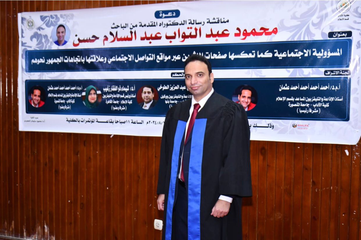 وأشرف على الرسالة الدكتور أحمد أحمد أحمد أحمد عثمان، أستاذ الإذاعة والتليفزيون المساعد بقسم الإعلام بكلية الآداب في جامعة المنصورة.